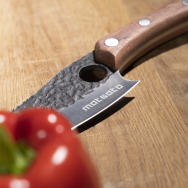 Questo è un ottimo prodotto, il design è molto ergonomico, un buon coltello che in mano lo senti forte e robusto. Offre una buona presa e sta saldamente nel palmo della mano. È abbastanza leggero per tagliare le verdure e abbastanza pesante per la carne. Ha un buon peso. L'artigianato e il design sono superbi, molto consigliato.